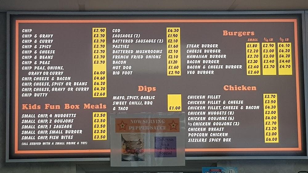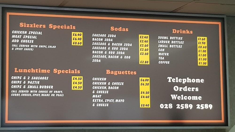 Kells is a charming village in Ballymena, UK, known for its warm community and welcoming atmosphere. Sizzlers stands out with its vibrant facade and accessibility features, making it a go-to spot for both locals and visitors. Located just a short drive from the bustling town center, this eatery is easy to spot and conveniently situated for a quick meal. The surroundings are relaxed, with plenty of free street parking available, allowing you to pop in without any hassles. The atmosphere feels friendly and casual, where you can enjoy a hearty meal while soaking in the local vibe. Notably, Sizzlers caters to everyone, including families and tourists, ensuring there's something for everyone in the diverse menu.
